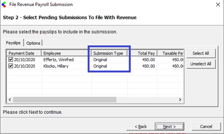 Press Next to continue to select the payroll that are to be included in the submission. You can opt to exclude an employee from a submission, in which case they will be picked up on the next submission that you make.
