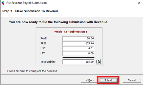 Press Next to continue to the submission screen where you can view the totals of PAYE, PRSI, USC and LPT that are about to be submitted.