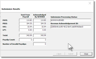Once Revenue has processed your submission Payroll will receive an acknowledgement message with a unique “Acknowledgement ID” and confirmation of the count of payslips received along with the totals of PAYE, PRSI, USC and LPT.