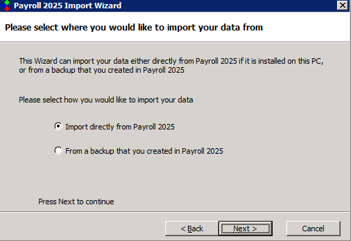 On the next screen you will be asked if you want to import directly from the 2025 software that you have opened, or if you want to import from a backup.
