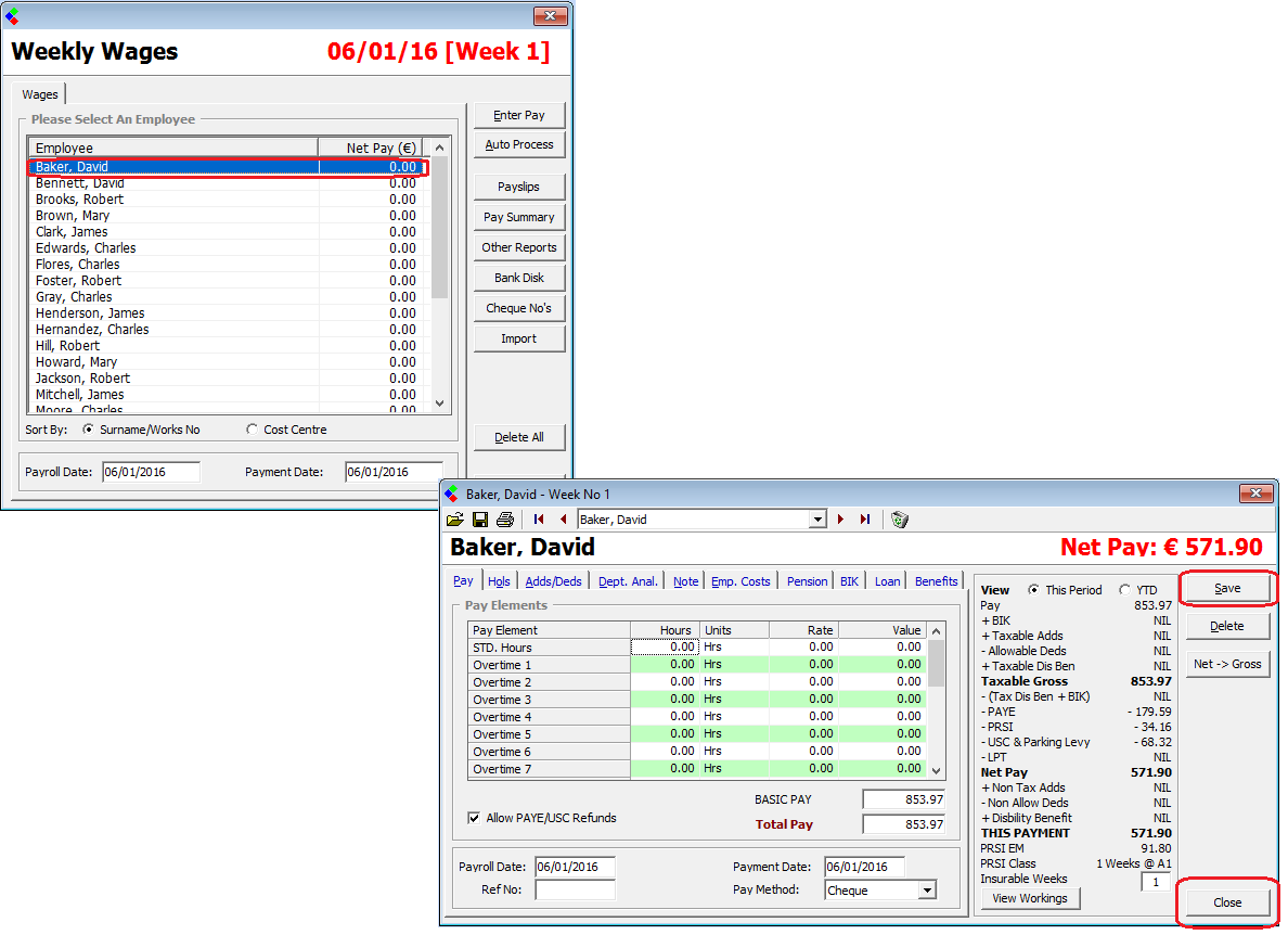 Once all payroll entries are complete for the pay period simply Close the Wages listing.