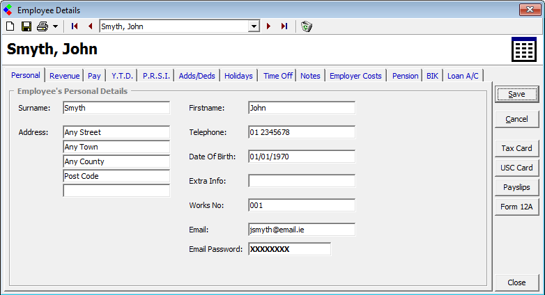 Once the Company has been setup each employee record can be created. An employee record must be created before any payroll can be processed for that employee through CollSoft Payroll. An employee record can be amended at any time, for example, to update Revenue Details (tax credits, SRCOP, USC), change payment method, setup payslip email options etc.