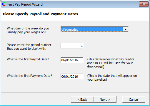 It is important that the initial pay period is set up correctly as this will affect each subsequent pay period and may create an issue at the end of the tax year if set incorrectly in the initial period.