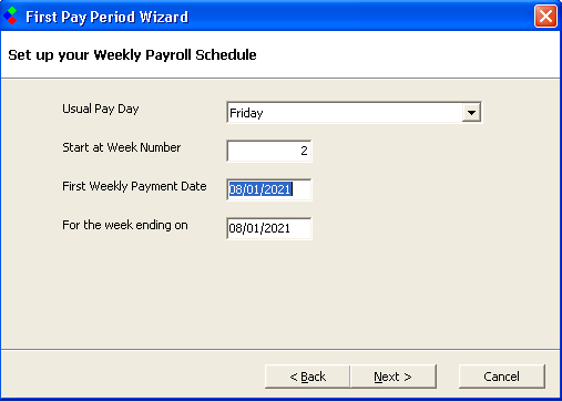 When you run your first Payroll in the software you will be shown the "First Pay Period" wizard where you will be able to specify the starting Week Number, the first Payment Date and the Period Ending Date.