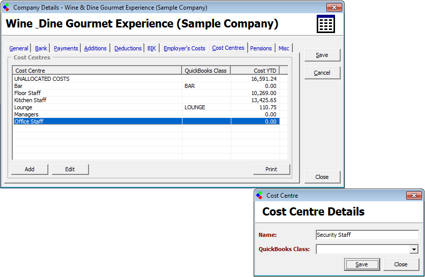 You can add Cost Centres to the payroll by clicking on the company button and clicking on the Cost Centres tab.