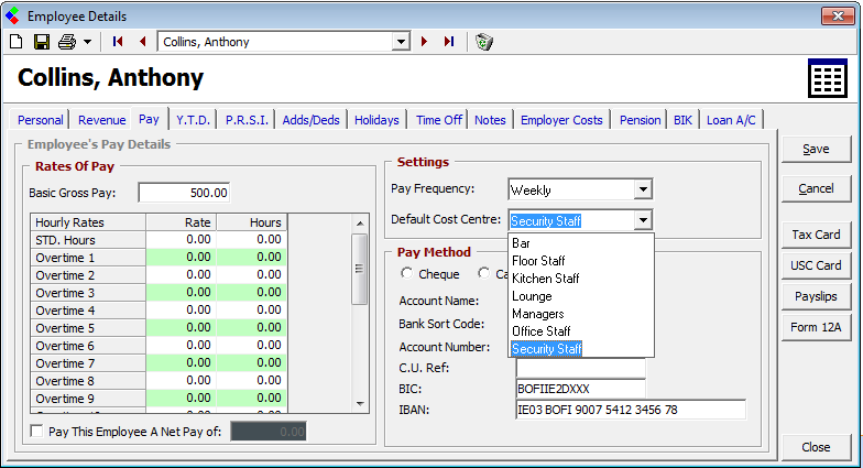 Then click on the Pay Tab and select a cost centre for this employee from the ‘Default Cost Centre’ drop down menu.